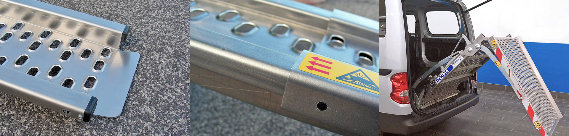 Les rampes Movia estan construïdes, íntegrament en alumini, i sense soldadures amb longituds entre 1,5 i 3,9 mts. El seu tret distintiu és la superfície 'punyida', la qual cosa les fa molt resistents malgrat la seva lleugeresa, i els proporciona una adherència excepcional a prova d'aigua, fang, etc.