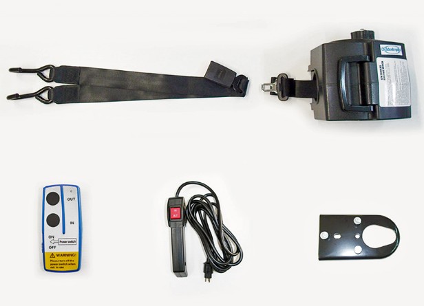 Se sujeta un doble cinturón al cabrestante, operado por un control remoto, mediante un accesorio de seguridad para enganchar la silla de ruedas.